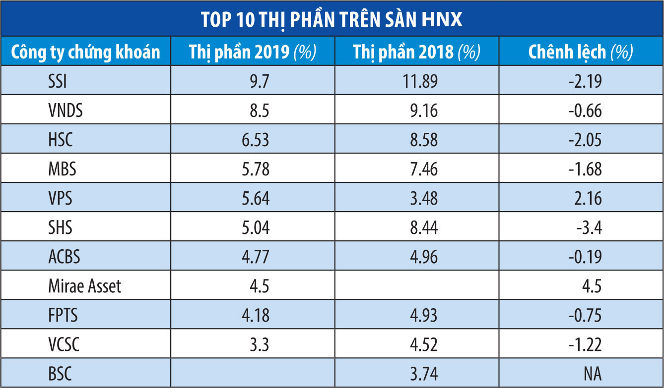 Trên sàn HNX cũng có những yếu tố bất ngờ trên bảng xếp hạng thị phần quý IV và cả năm 2019.
